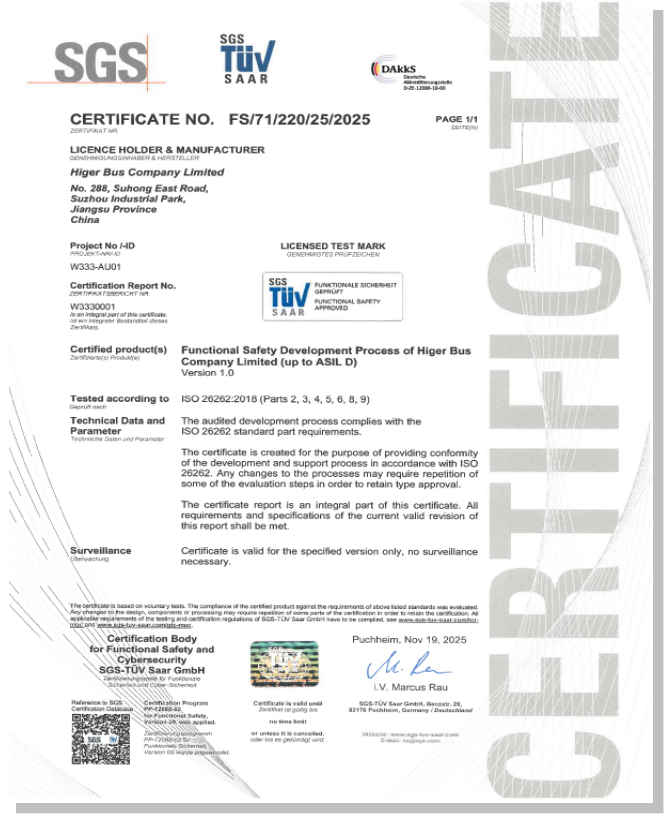 獲得ISO 26262認證是蘇州金龍在踐行“安全為本”理念進程中的重要里程碑。未來,蘇州金龍將繼續(xù)深化功能安全體系的落地與實踐,將其全面融入每一款產品的研發(fā)與制造環(huán)節(jié),致力于以更高水平的安全、可靠與智能的客車產品,服務全球市場,切實履行保障公眾出行安全的企業(yè)社會責任。