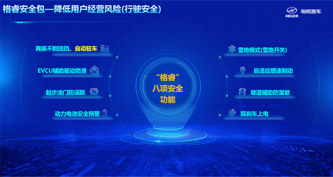 在蘇州金龍2024年推出的最新款產品新V系客車上,蘇州金龍還特別針對純電版本新V系客車推出“格睿安全包”,搭載EVCU輔助驅動防滑、起步油門防誤踩、動力電池安全預警、坡道輔助防溜坡等八項安全功能。